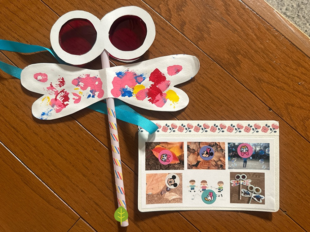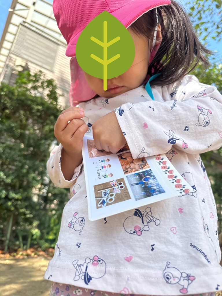 公園内で落ち葉やダンゴ虫、シャボン玉やニョロニョロへびを見つけて、見つけたらシールを貼ります。