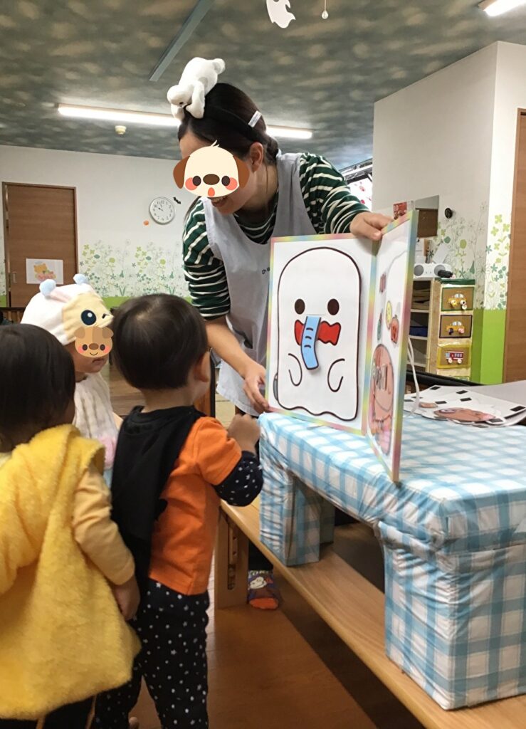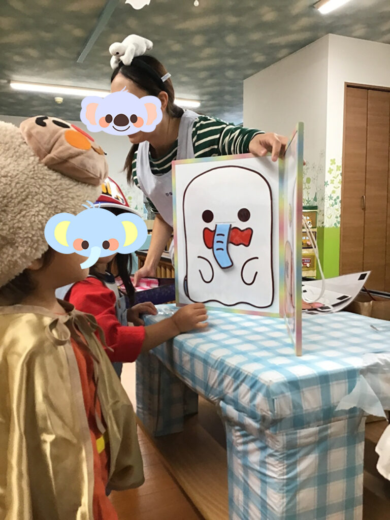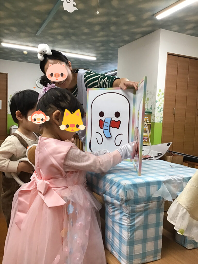 ハロウィンについてお話をしているとひなた保育園に仮装した動物さんたちがやってきました。