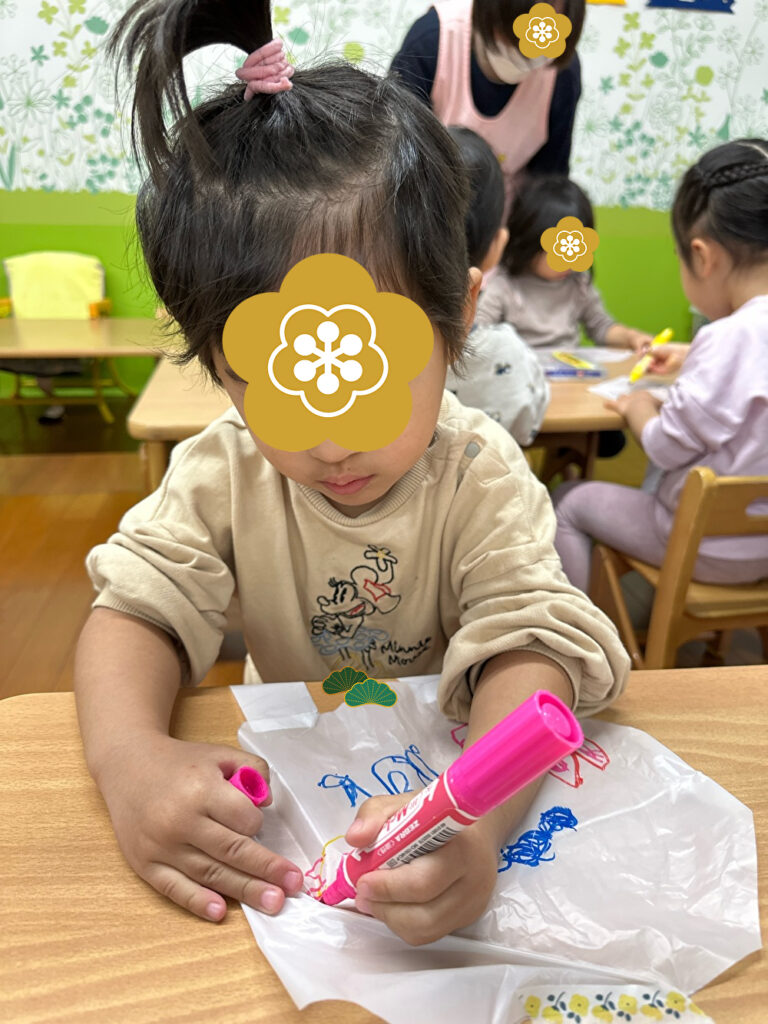 ビニール袋にマジックでお絵描き♪好きな色を使ってたくさん描きました!