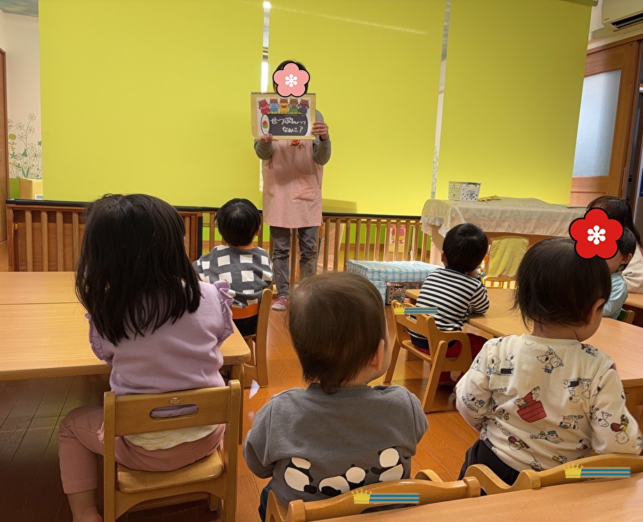 「節分はおばけと鬼どっちが来る?」「鬼ー!」とクイズ形式で節分についてたくさんのことを知りましたよ。