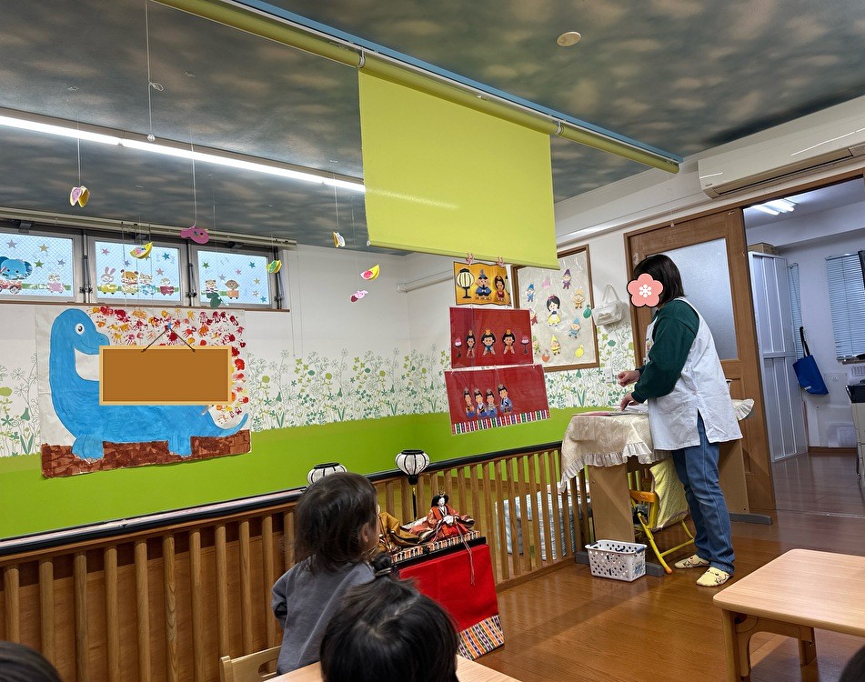 ひなた保育園でも、子どもたちにわかりやすいようにひな人形や行事食についてお話をしました。